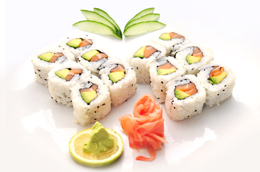1 soupe, 1 salade 12 Pièces de maki califonia (saumon et avocat)