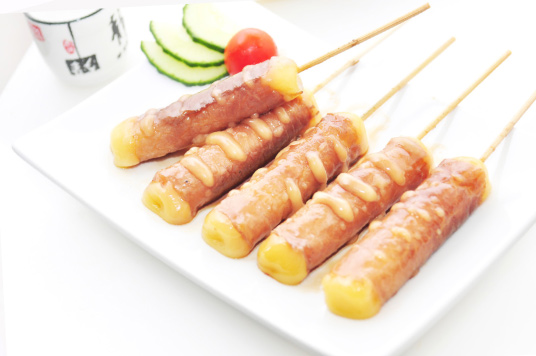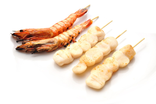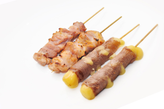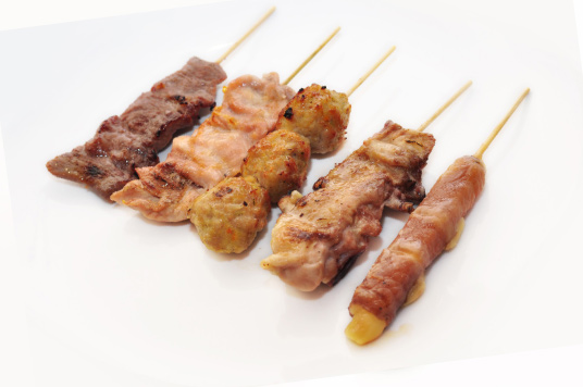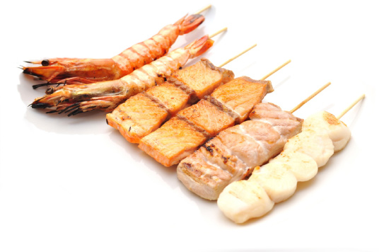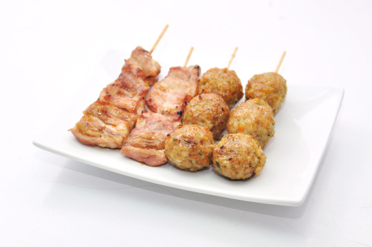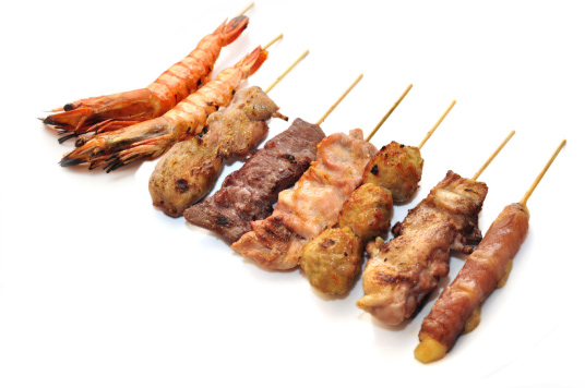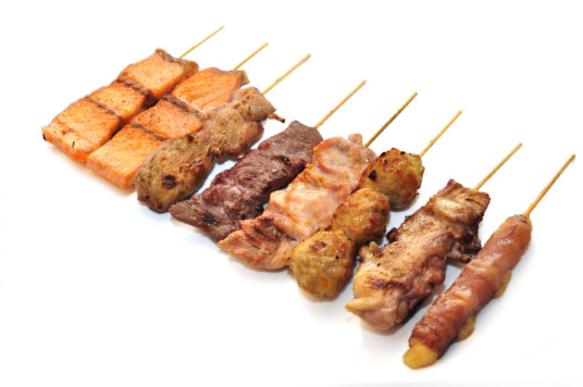 Soupe, Salade, Riz 8 Brochettes : (1 poulet, 1 boulettes de poulet, 1 ailes de poulet, 1 boeuf, 1 boeuf au fromage, 1 caille, 2 gambas)