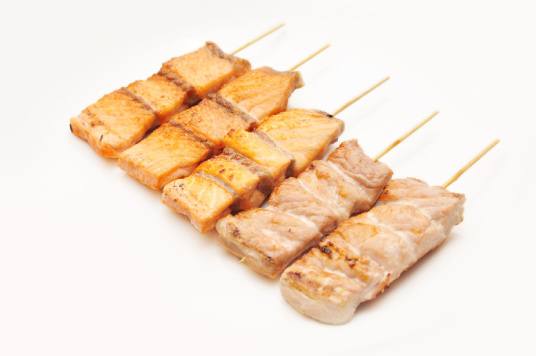 Soupe, Salade, Riz, 8 Brochettes (1 poulet, 1 boeuf, 1 boulettes de poulet, 1 ailes de poulet, 1 boeuf au fromage, 2 saumon, 1 caille)